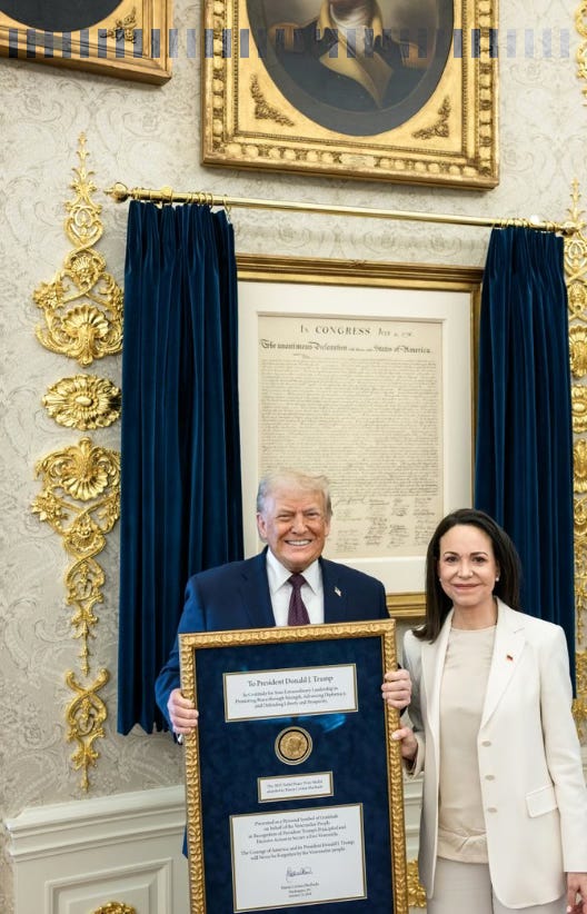 On 15 January 2026, Venezuelan opposition leader María Corina Machado met President Donald J. Trump at the White House. An official photograph, shared by the White House on X the following day, shows President Trump smiling as he holds a large, ornate gold frame containing the 2025 Nobel Peace Prize medal. A plaque beneath it thanks him for his “extraordinary advocacy promoting liberty and prosperity”, citing his “Venezuelan Freedom Project” and his “principled and decisive action to secure a free Venezuela”. Machado stands beside him, composed and resolute.